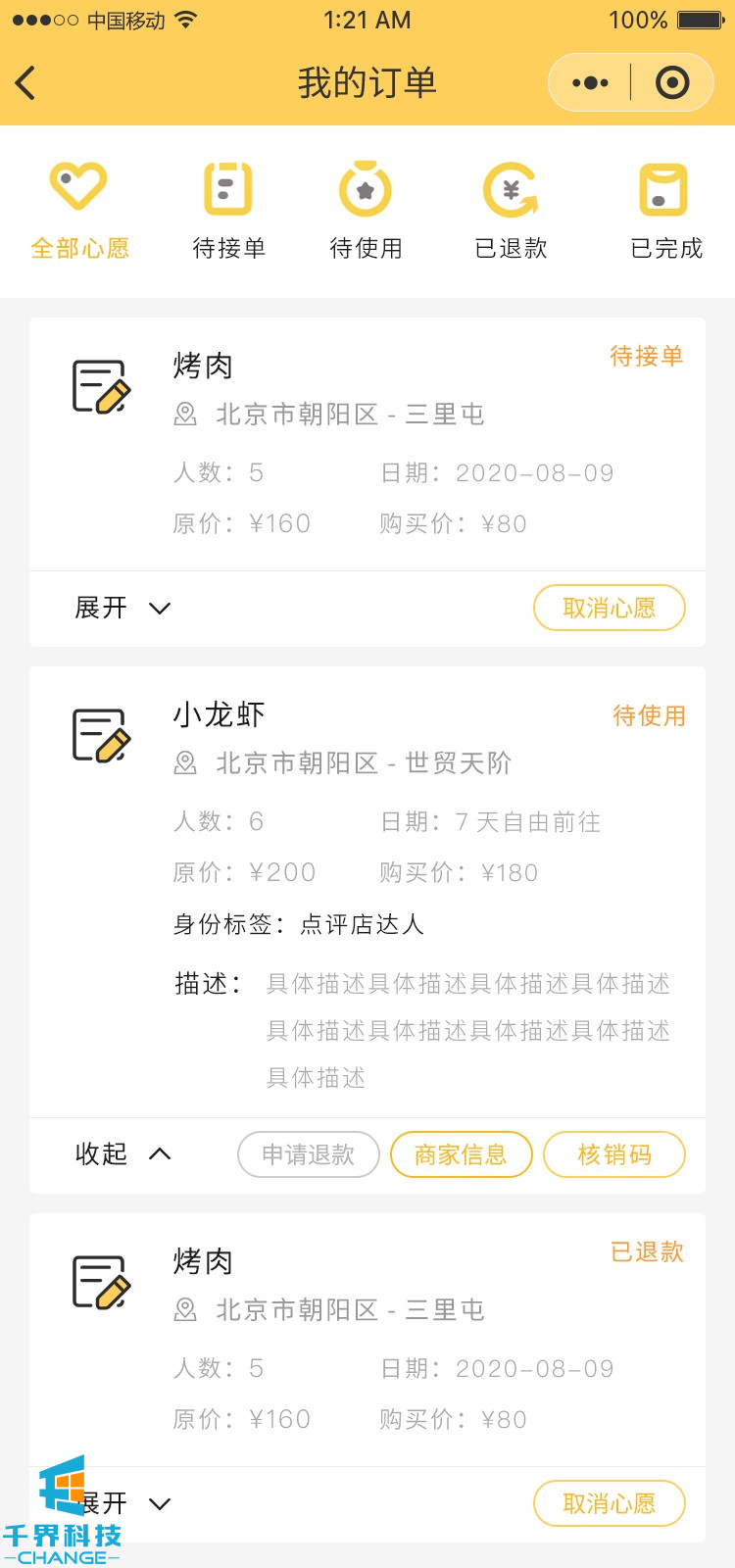 該項目是一個(gè)許愿餐小程序,主要功能有用戶(hù)發(fā)起愿望清單,商家端可以搶單接單,用戶(hù)去實(shí)體店核銷(xiāo)等功能