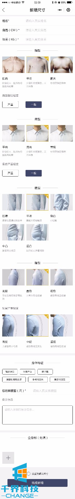 該項目是服裝定制小程序,包含在線(xiàn)下單、定制選項、尺寸上傳、訂單等