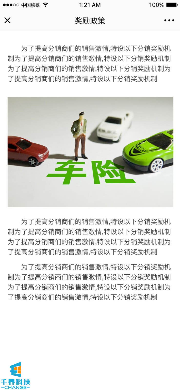 該項目用戶(hù)線(xiàn)上可選擇車(chē)險類(lèi)型,填寫(xiě)購買(mǎi)車(chē)險參數,上傳個(gè)人資料信息等,后臺受理,購買(mǎi)車(chē)險。用戶(hù)自動(dòng)成為分銷(xiāo)推廣員,發(fā)展團隊獲客推廣賺錢(qián)。