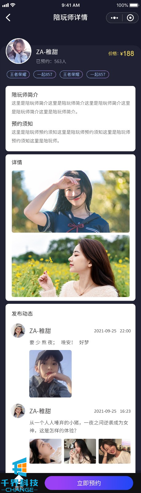 該項目用戶(hù)可以在小程序上置頂一個(gè)陪玩師下單,陪玩師端接單后雙方確認訂單,然后線(xiàn)下服務(wù)的小程序,陪玩師可以發(fā)布動(dòng)態(tài),用戶(hù)可以看到每個(gè)陪玩師發(fā)布的動(dòng)態(tài)。