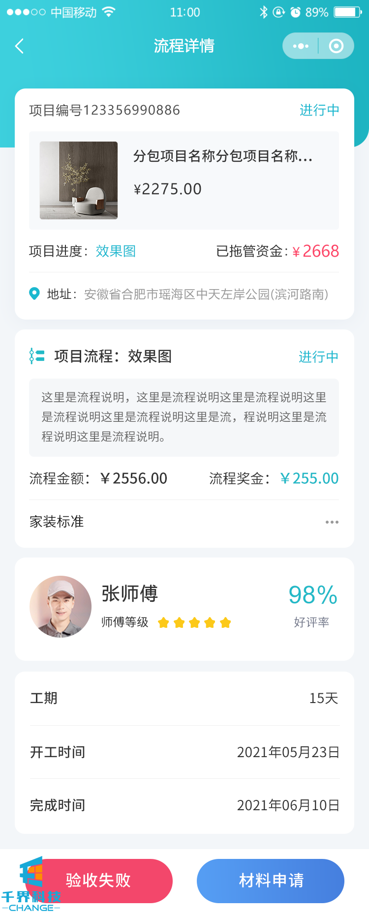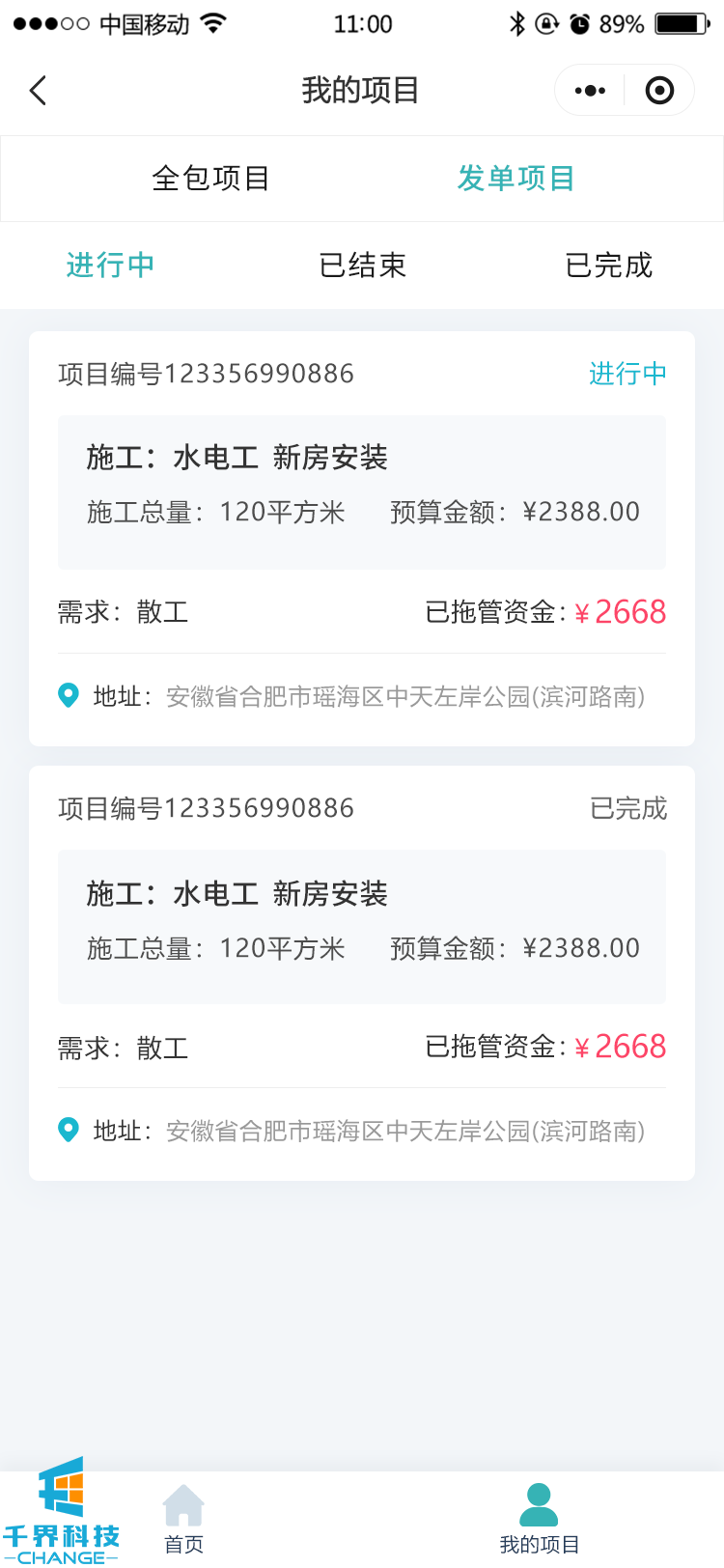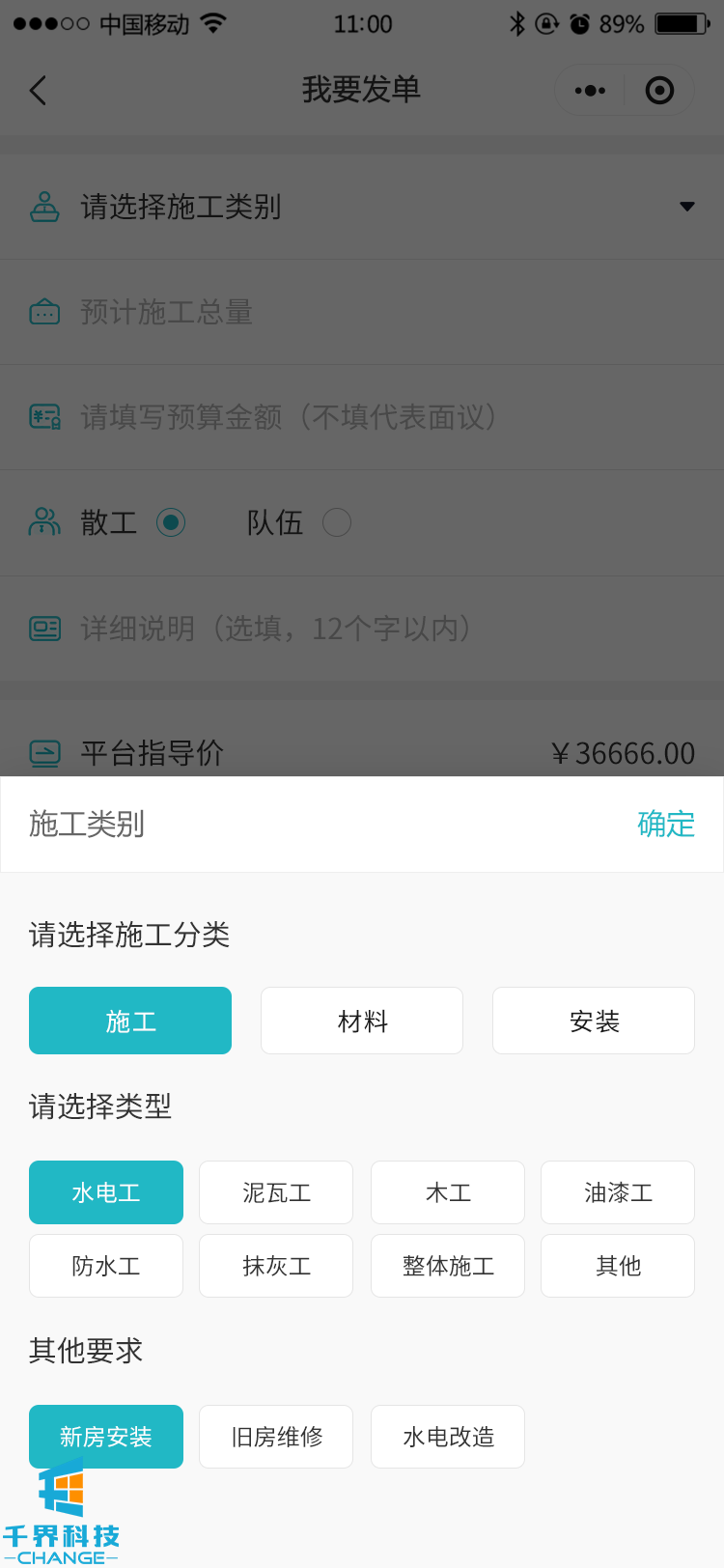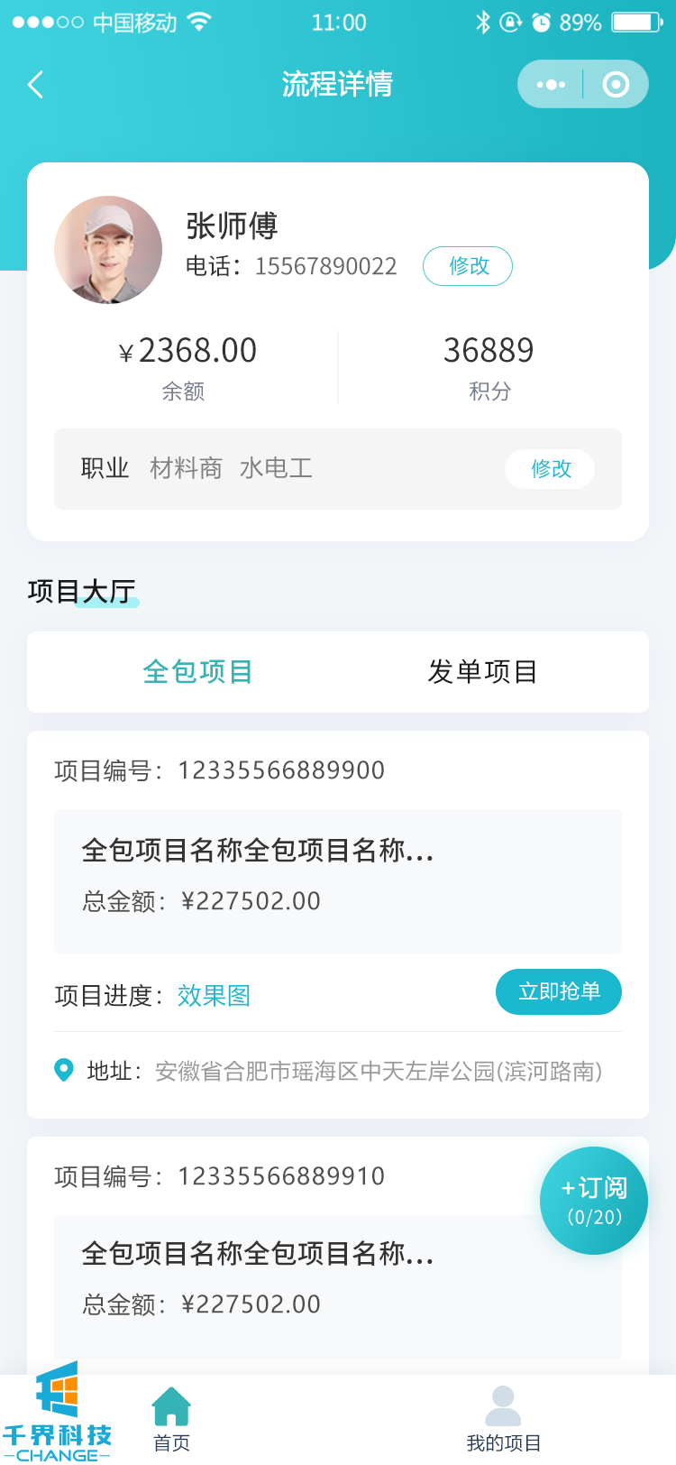 該項目一個(gè)家裝小程序,平臺有分包和整包,分包是用戶(hù)在前端下單,對應的師傅進(jìn)行接單,整包是后臺進(jìn)行發(fā)包,每個(gè)節點(diǎn)的師傅相應的報名接單
