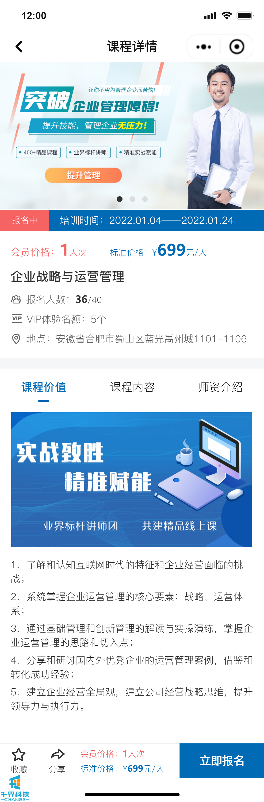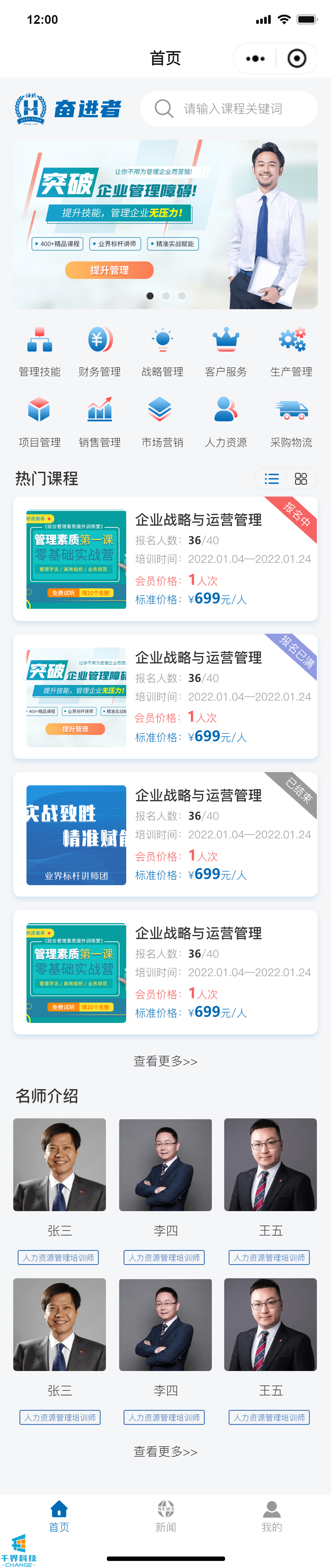該項目是一個(gè)線(xiàn)下課程報名的小程序,分為學(xué)員端口和企業(yè)管理員端口,可在線(xiàn)進(jìn)行報名操作,線(xiàn)下支付費用,企業(yè)管理員和后臺帶有數據統計功能,根據課程、學(xué)員維度統計實(shí)際的報名情況