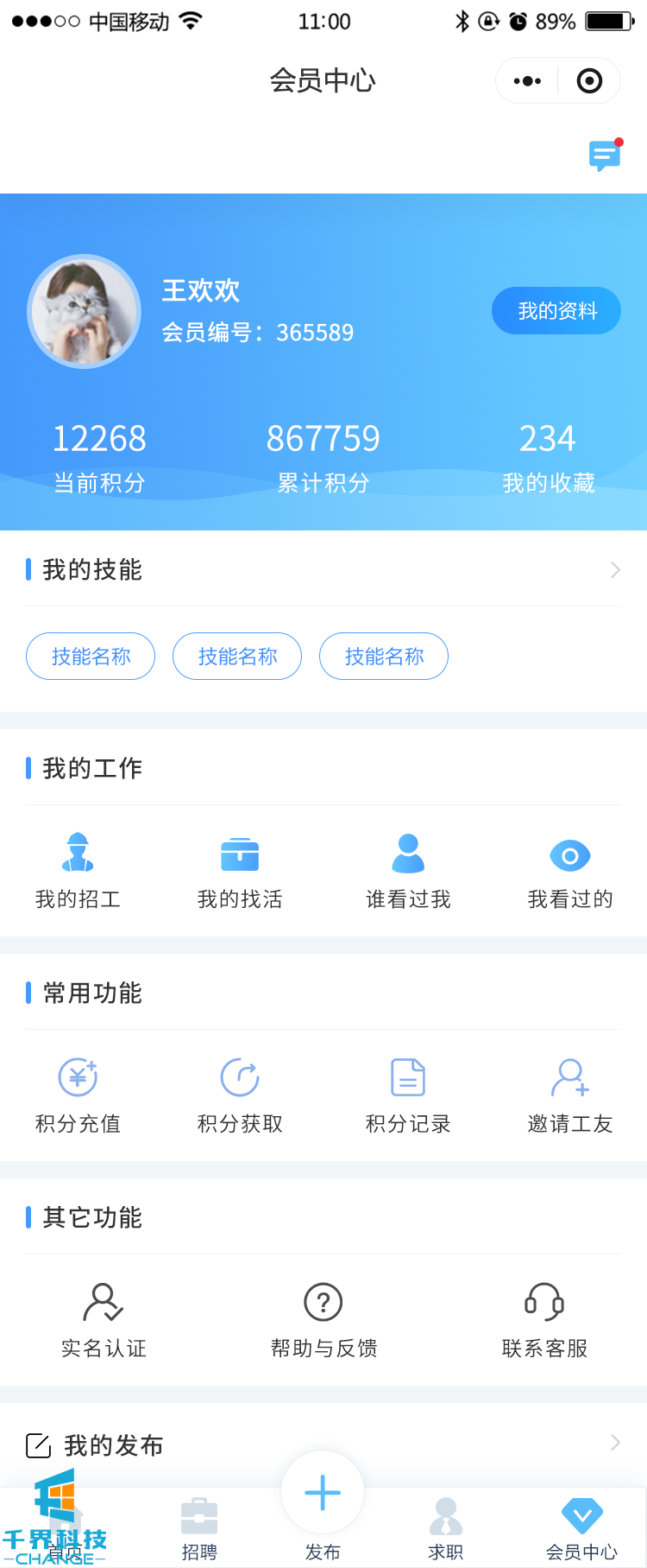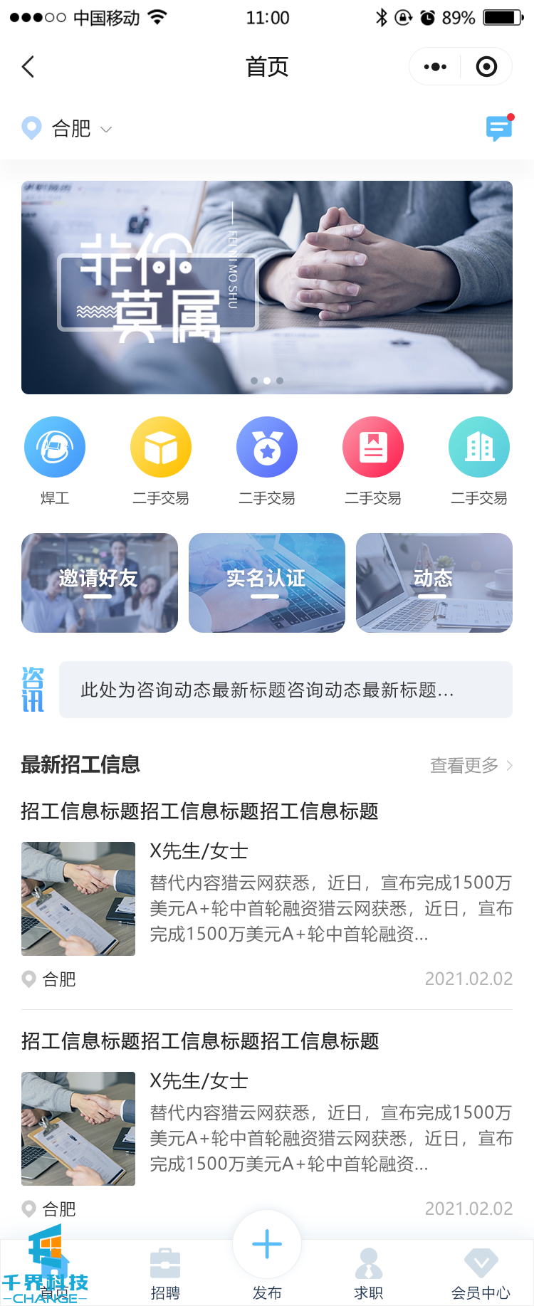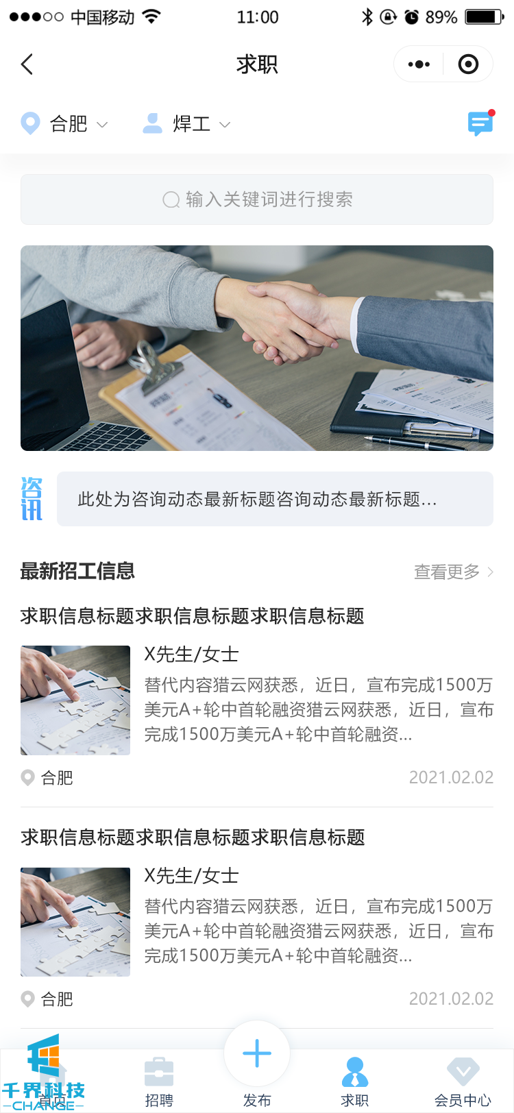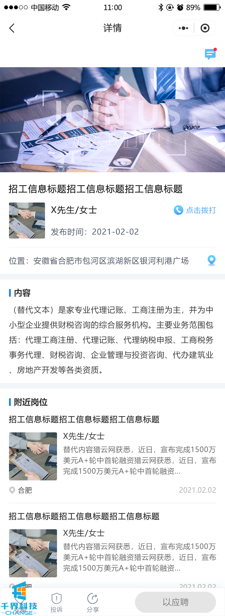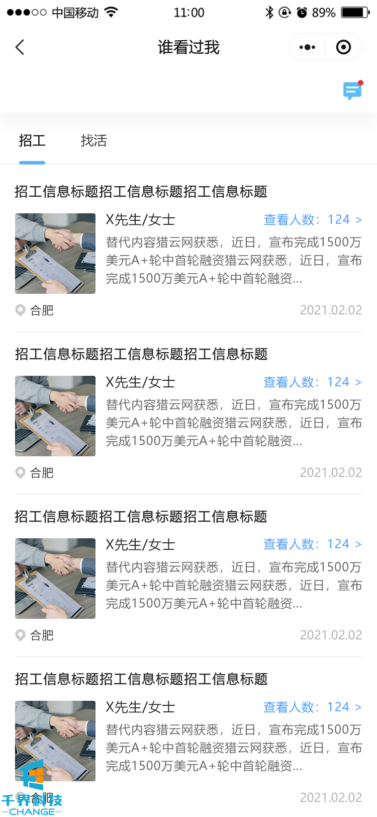 該項目是一個(gè)工人求職,企業(yè)招工類(lèi)似魚(yú)泡網(wǎng)的小程序,有發(fā)布求職信息,招工信息,添加自己的技能,積分充值,積分置頂等功能。