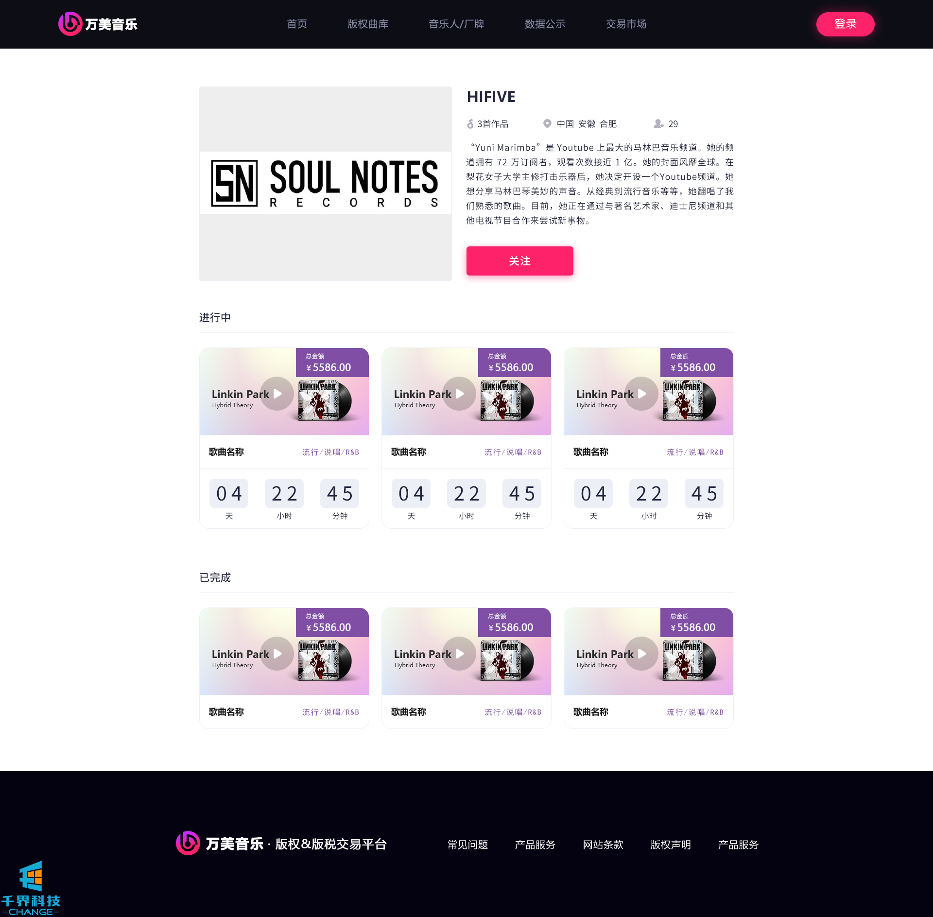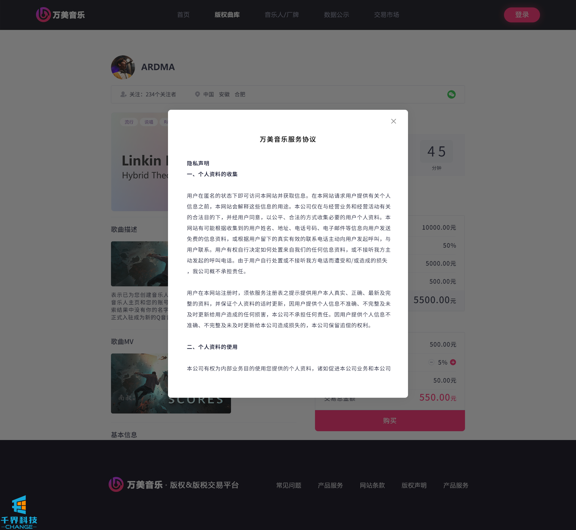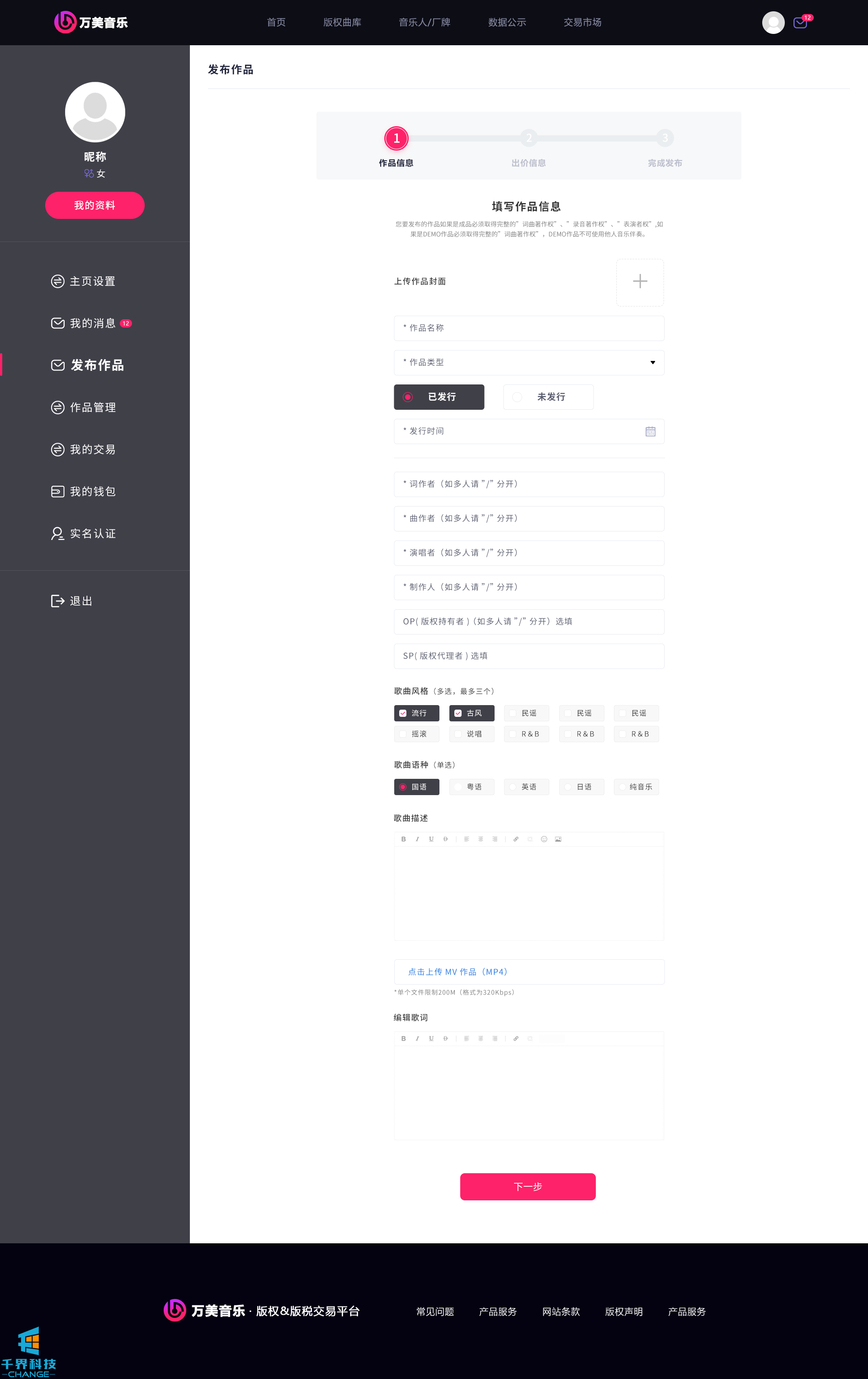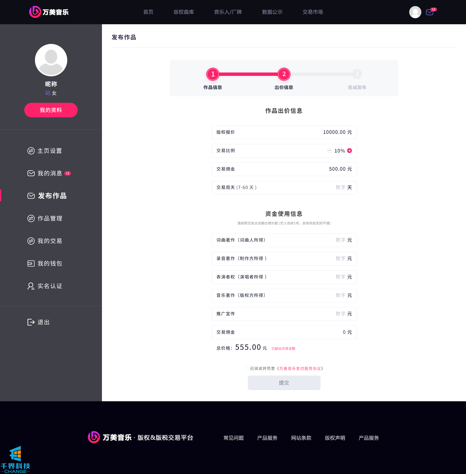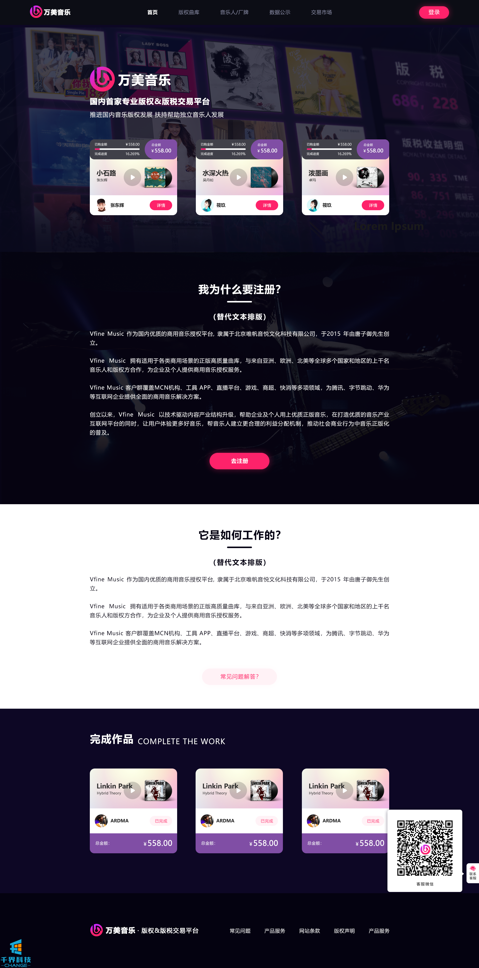 該項目是一個(gè)音樂(lè )網(wǎng)站版權交易網(wǎng)站,音樂(lè )人或者公司可以在網(wǎng)站上出售自己的創(chuàng )作的音樂(lè ),普通用戶(hù)可以通過(guò)購買(mǎi)對應版權,平臺后期會(huì )根據對應的版稅收入給到購買(mǎi)版權的普通用戶(hù)獎勵。