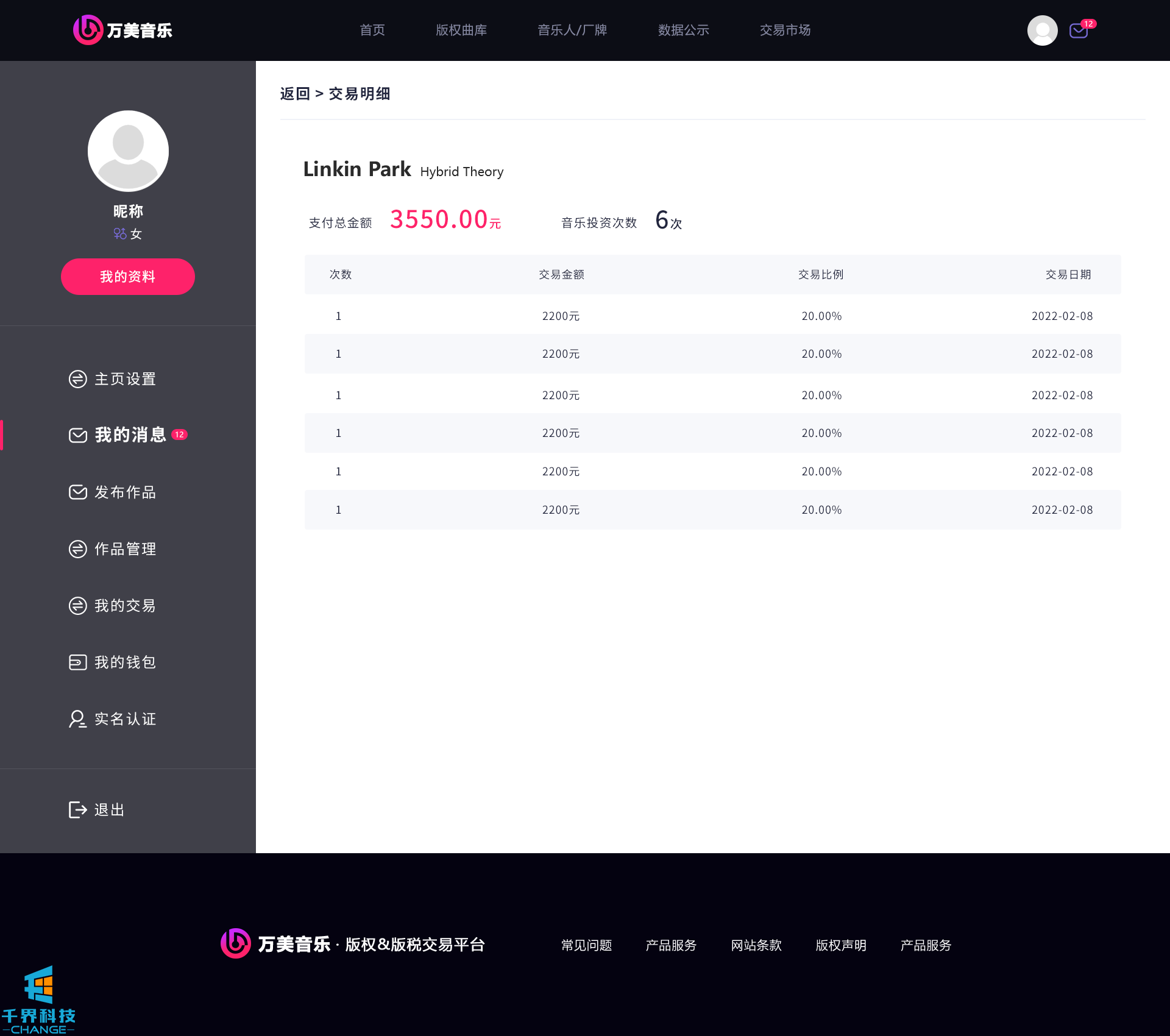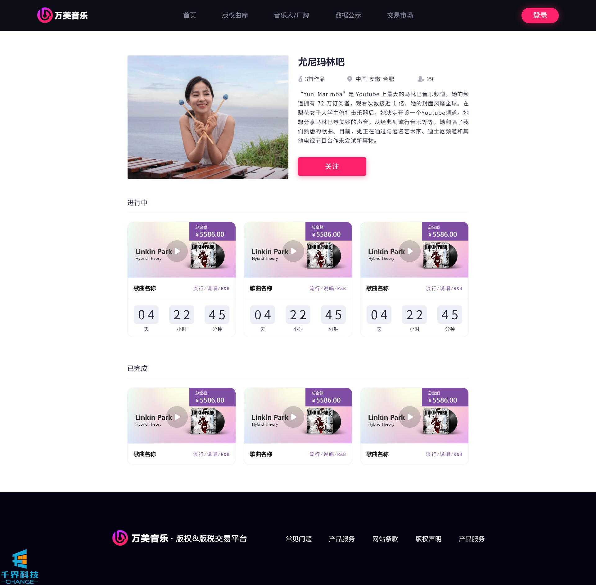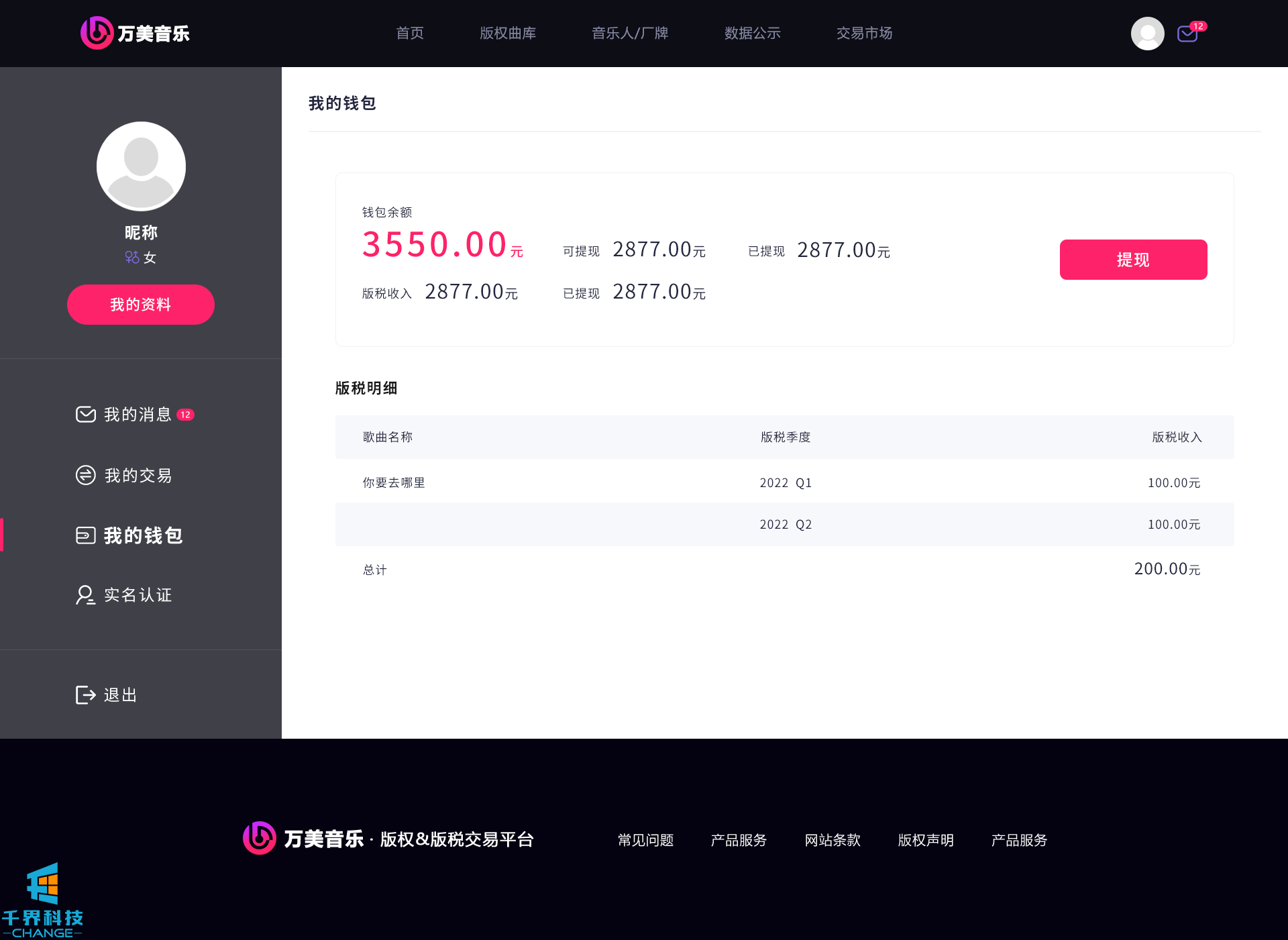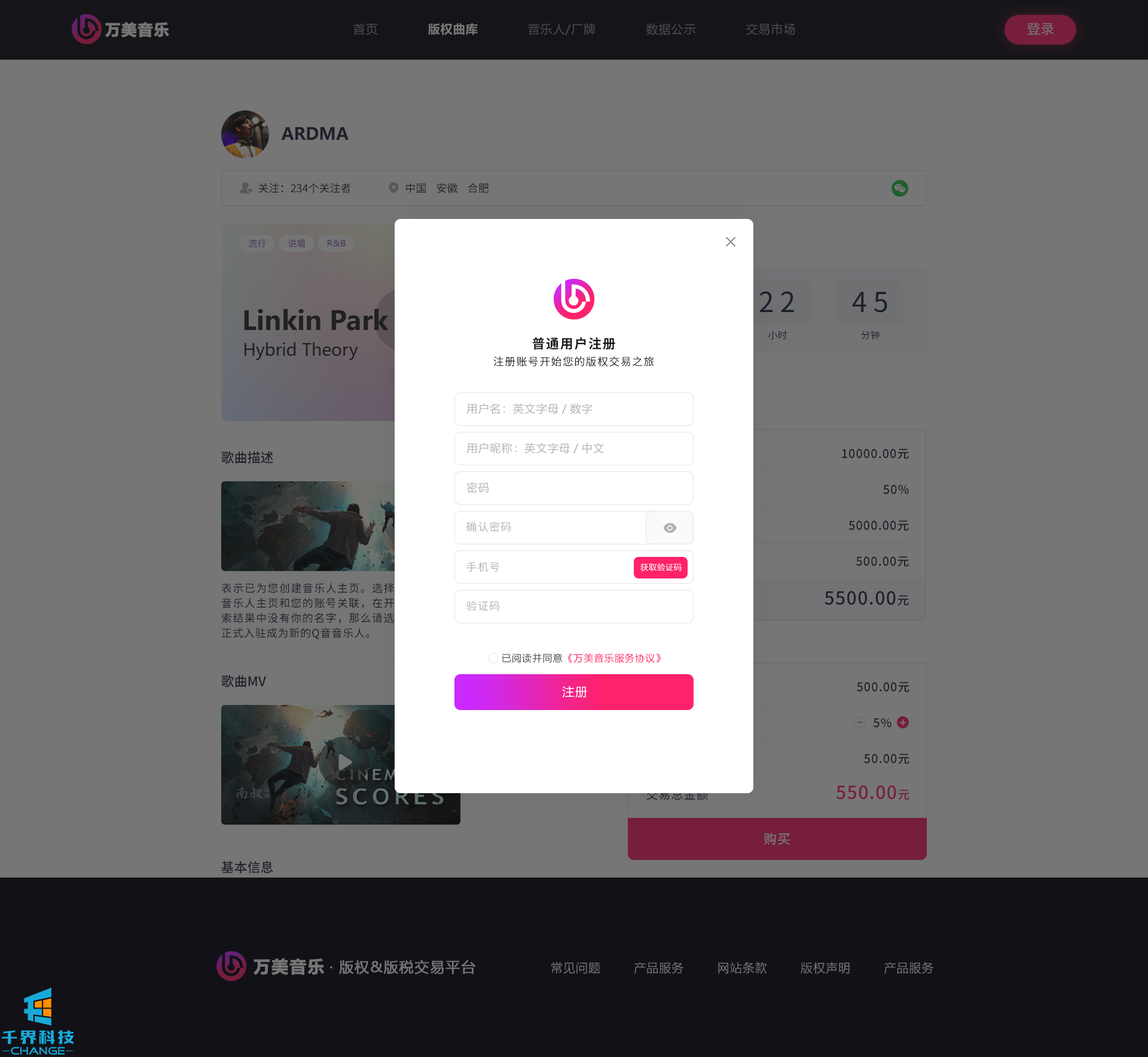 該項目是一個(gè)音樂(lè )網(wǎng)站版權交易網(wǎng)站,音樂(lè )人或者公司可以在網(wǎng)站上出售自己的創(chuàng )作的音樂(lè ),普通用戶(hù)可以通過(guò)購買(mǎi)對應版權,平臺后期會(huì )根據對應的版稅收入給到購買(mǎi)版權的普通用戶(hù)獎勵。