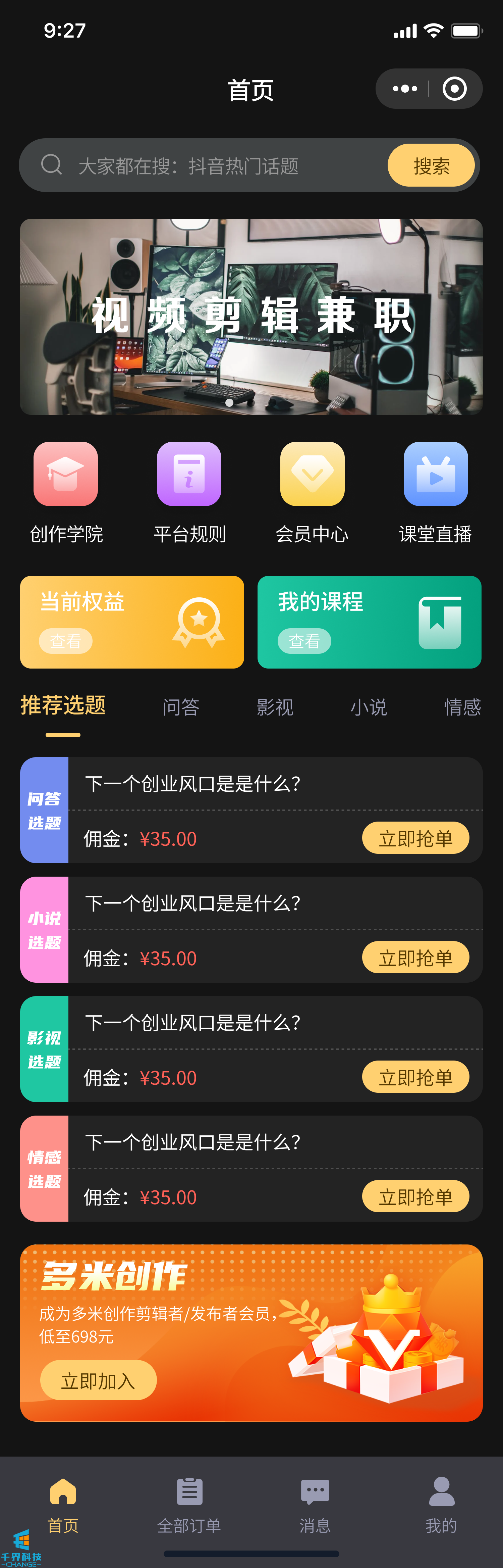 該項目是一個(gè)兼職做任務(wù)的小程序,主要功能是后臺發(fā)布任務(wù),前端兼職做任務(wù)得傭金,有會(huì )員,視頻課程,等功能。