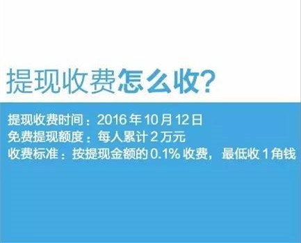 10月12日起,支付寶公布將對個(gè)人用戶(hù)超過(guò)免費額度的提現收取0.1%的服務(wù)費,每人累計有2萬(wàn)元基礎免費額度。