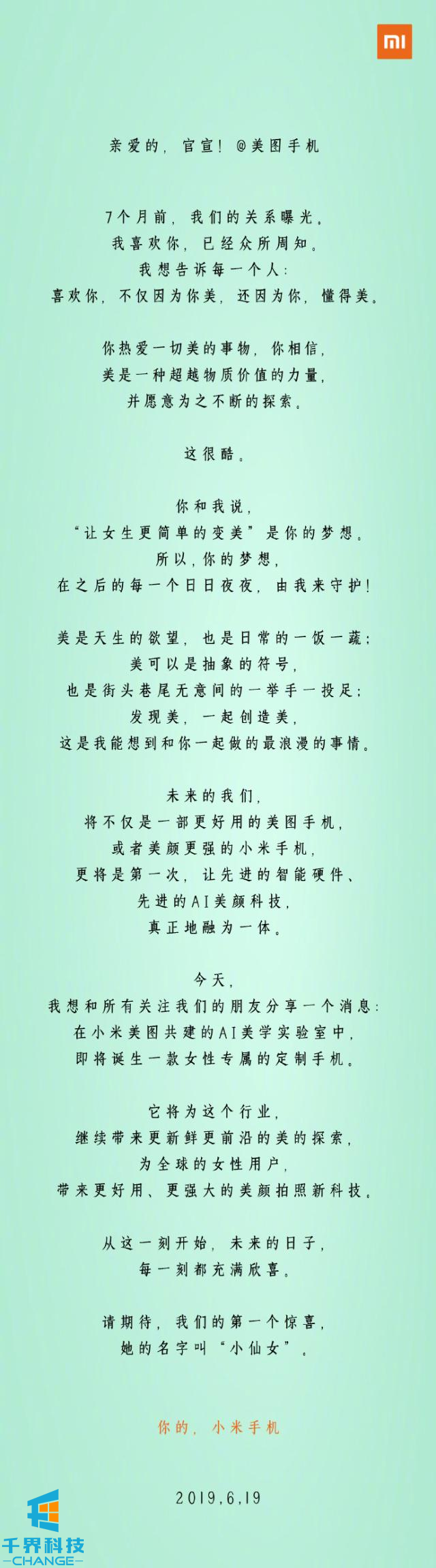 6月19日消息,小米手機官方發(fā)布微博稱(chēng)在小米美圖共建的AI美學(xué)實(shí)驗室中將誕生一款女性專(zhuān)屬的定制手機,名字叫做“小仙女”。