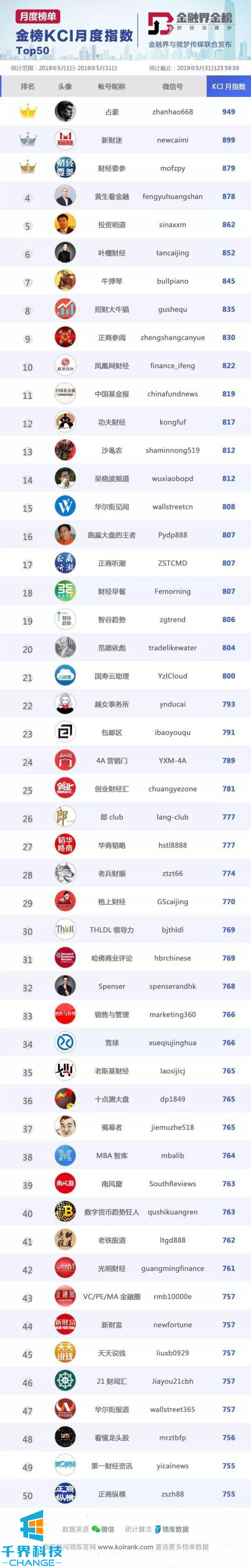 金榜」題名—2019年5月份財經(jīng)金融類(lèi)公眾號影響力報告,旨在用數據洞察金融行業(yè)發(fā)展態(tài)勢!以便為廣大財經(jīng)金融類(lèi)自媒體人及合作伙伴帶來(lái)參考價(jià)值。報告統計時(shí)間為2019年5月1日—2019年5月31日。